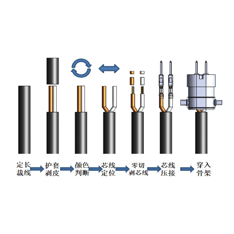 本設(shè)備適用于雙芯線線束進(jìn)行主動送線、線束校直、定長裁切、切剝外皮、芯線顏色分辨、剝芯線、端子壓接、壓接檢測、穿塑殼工作。